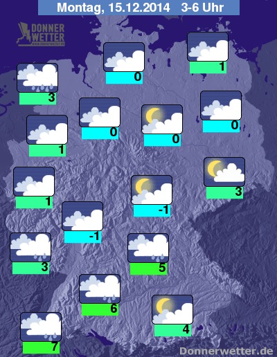 In der Nacht zum Montag bleiben die Wolken im Süden überwiegend verschlossen und es fällt weiterer Regen, auch sonst ist es meist stark bewölkt oder bedeckt, jedoch zunächst trocken, bevor im Nordwesten neue dichte Wolken mit Regen, Schneeregen und Schnee aufziehen, dazu kann es stellenweise glatt auf den Straßen werden. Die Temperatur sinkt auf 7 Grad im Breisgau und etwa -1 Grad im Taunus.