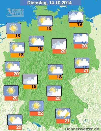 Am Dienstag ziehen im Osten und Nordosten vielfach dichte Wolken durch und es fällt zeitweise Regen, auch am Alpenrand ist es teils unbeständig mit möglichen Schauern und Gewittern, sonst erwarten wir aber verbreitet heiteres, teils auch sonniges Wetter, dabei bleibt es trocken. Die Temperatur steigt auf 18 bis 22 Grad.