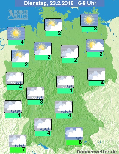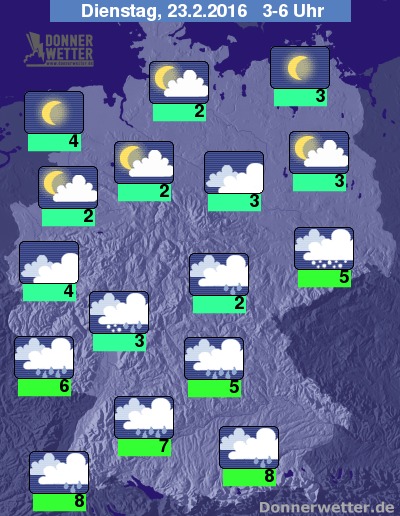 In den frühen Morgenstunden des Dienstag lockert die Wolkendecke im Norden immer weiter auf, entlang der Nord- und Ostseeküste kann es auch aufklaren. Unter bedecktem Himmel verweilen weiterhin weite Teile der Südhälfte. Dabei fällt immer wieder Regen, in höheren Lagen auch Schneeregen oder Schnee. Achtung Glätte durch überfr. Nässe.