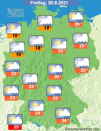 Am Freitag ziehen teils dichte Wolken durch, teils zeigen sich auch Aufheiterungen, dabei bilden sich gebietsweise Schauer. Die Temperatur steigt auf Werte von 18 Grad in Hamburg und bis 25 Grad in Freiburg.