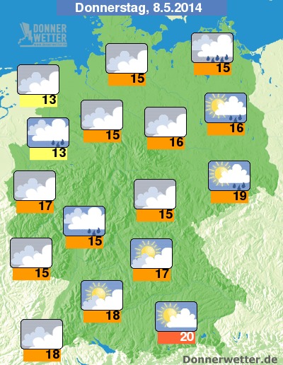 Wenig ändert sich an den Temperaturen: Höchstwerte um 13 Grad C im Nordwesten und bis 20 Grad C entlang der Alpen.