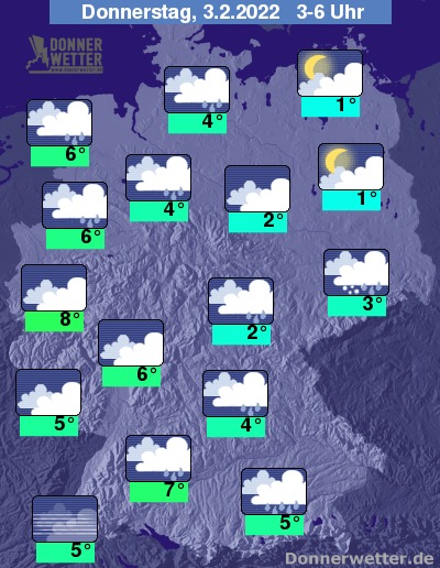 Am Donnerstag bleibt es überall bedeckt, oft ist es zudem auch neblig-trüb, von Bayern bis zur Ostsee fällt anfangs zeitweise Regen, sonst bleibt es zumeist trocken oder es fallen nur ein paar Tropfen. Die Temperatur steigt auf 6 Grad in der Lausitz und bis 9 Grad am Rhein.