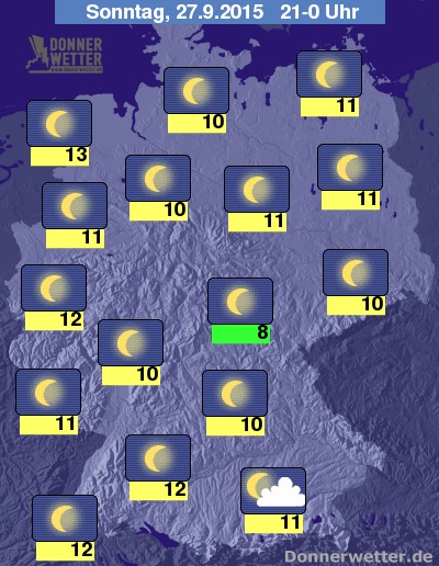 Heute Abend zeigt sich Deutschland unter einem verbreitet sternenklarem Himmel, einige Wolken können sich jedoch im Südosten des Landes zeigen, es bleibt aber überall trocken. Die Abendtemperatur liegt bei 13 Grad in Ostfriesland und 8 Grad am Thüringer Schiefergebirge.