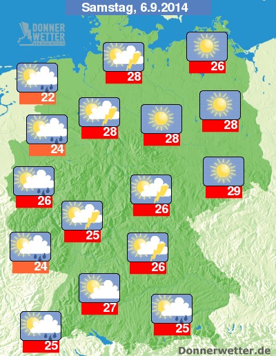 Der morgige Samstag startet fast überall noch freundlich, jedoch werden die Wolken im Tagesverlauf zahlreicher und insbesondere am Nachmittag bilden sich bevorzugt in der Südwesthälfte Deutschlands zum Teil dichte Quellwolken und es können sich Schauer und Gewitter ausbilden. Im Osten und Nordosten bleibt es bis zum Abend dagegen vielfach sonnig und trocken. Die Temperatur steigt auf 22 Grad an der ostfriesichen Nordseeküste und auf sommerliche 29 Grad in der Lausitz.