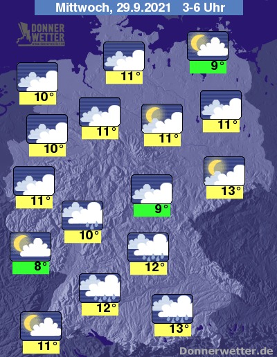 In der Nacht zum Mittwoch zieht ein Regenband über den Süden Deutschlands hinweg. Weiter nach Norden hin ist der Himmel ebenfalls oft stark, hier und da aber auch locker bis aufgelockert bewölkt, dazu bleibt es weitgehend trocken. Die Temperatur sinkt auf 13 Grad in Berchtesgaden und bis 8 Grad am Pfälzer Wald.