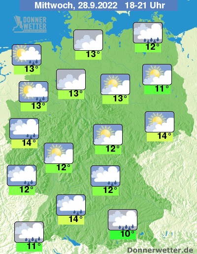 Heute Abend bleibt es im Süden bedeckt und es fällt zeitweise Regen. Im übrigen Bundesgebiet ist es teils stark, teils aber auch aufgelockert bewölkt, dabei bilden sich einzelne Schauer. Die Temperatur liegt bei 10 Grad in München und bis 14 Grad in Dresden.