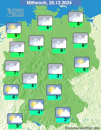 Am heutigen 1. Weihnachtsfeiertag ist es vor allem an den Alpen oft heiter, aber auch im übrigen Süden kann sich gebietsweise die Sonne zeigen, dabei bleibt es trocken. Weiter nach Norden hin ist es hingegen meist bedeckt, dabei fällt im Norden gebietsweise etwas Regen oder Sprühregen, sonst bleibt es aber weitgehend trocken. Die Temperatur steigt auf 2 Grad in Oberbayern und bis 9 Grad im nördlichen Emsland.