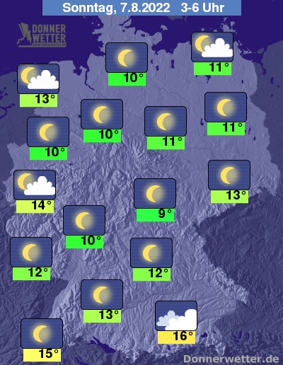 In der Nacht zum Sonntag ist der Himmel über dem Bundesgebiet verbreitet sternenklar oder nur gering bewölkt. Dichte Wolken halten sich über dem Südosten und am Alpenrand, dazu bleibt es trocken. Die Temperatur sinkt auf 16 Grad in München und 9 Grad in Jena.