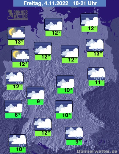 Heute Nachmittag hält sich über der Bundesrepublik verbreitet dichte Bewölkung und nur ganz selten zeigen sich mal Auflockerungen, am ehesten noch vom Niederrhein bis zur Nordsee. Vereinzelt bilden sich Schauer. Im Süden und Osten fällt gebietsweise Regen . Die Temperatur liegt bei 8 Grad am Westerwald und bis 13 Grad in Berlin.
