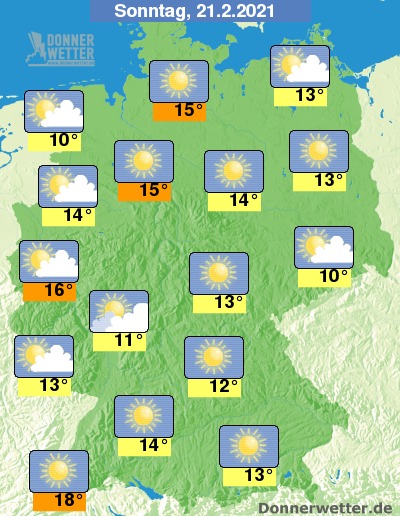 Am Sonntag ist es im Land verbreitet sonnig oder nur locker bewölkt, am Erzgebirge und an der Nordsee ziehen zum Teil dichte Wolken durch, dabei bleibt es trocken. Die Temperatur steigt auf 10 Grad direkt an der Nordsee und bis 18 Grad im Breisgau.