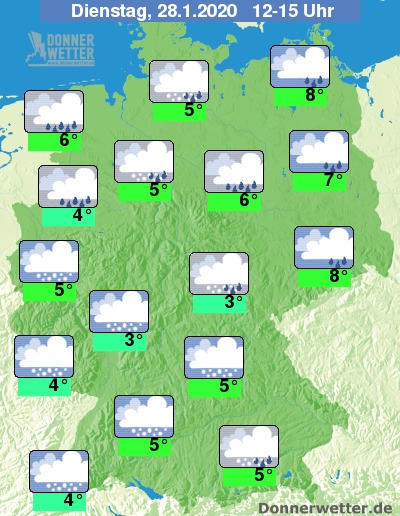 Am frühen Nachmittag ziehen dichte, graue Wolkenmassen übers Land und bringen immer wieder Niederschläge, zum Teil schauerartig verstärkt und auch mit örtlichen Gewittern. In Lagen oberhalb 300 bis 600 m kann es schneien. Dabei muss mit Glätte gerechnet werden. Auch in tieferen Lagen können sich in kräftigeren Schauern Schneeflocken und Graupelkörner unter die Tropfen mischen.