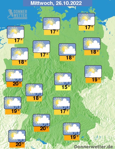 Heute zeigt sich das Wetter zum Teil heiter bis sonnig, teils ist es aber auch trüb oder stark bewölkt. Es bilden sich insgesamt nur selten Schauer bei Höchstwerten von 15 Grad in Erfurt und bis 20 Grad in Konstanz.