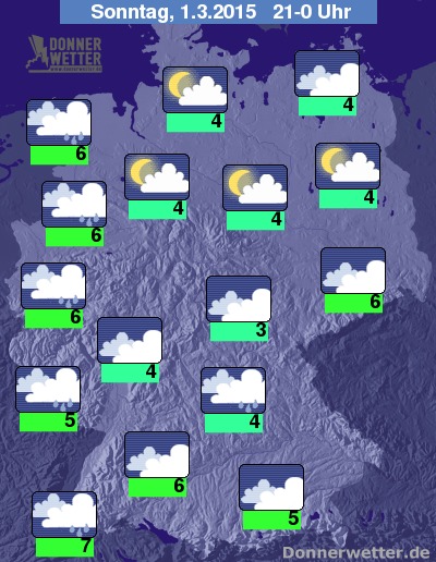 Heute Abend bleibt es zumeist stark bewölkt oder bedeckt, der Regen klingt aber zunächst meist ab und nach Norden hin kann die Wolkendecke auch häufig auflockern. Im weiteren Abendverlauf kommen im Norden und Westen, aber auch im Süden neue dichte Wolken mit teils kräftigem Regen auf. Im Osten und in der Mitte des Landes bleibt es hingegen weitgehend trocken, aber auch hier werden die Wolken wieder dichter. Die Abendtemperatur liegt bei 7 Grad im Breisgau und um 3 Grad im Coburger Land. Im Norden und Westen weht ein teils starker Wind, in Böen ist der Wind teils stürmisch. Auf den Bergen und an den Küsten sind Sturmböen möglich.