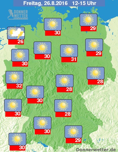 Heute Abend sind im Nordseeumfeld hier und da noch einige Wolken möglich, meist bleibt es dabei allerdings trocken. Im übrigen Bundesgebiet bleibt es verbreitet sonnig und trocken bei Werten von anfangs 26 Grad in Emden und noch bis 33 Grad in Köln.