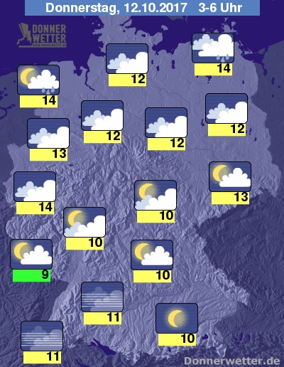 In der Nacht zum Donnerstag bleibt es im Süden meist sternenklar, hier und da kann sich Nebel bilden, dazu bleibt es trocken. Über den Norden und NRW ziehen dichte Wolken mit gebietsweise auch Regen hinweg. Im übrigen Land ist es meist aufgelockert bewölkt und trocken. Die Temperatur sinkt auf 14 Grad in Rostock und bis 9 Grad im Saargau.