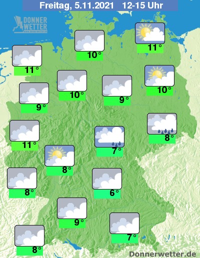 Heute Abend lockert die Bewölkung im Norden gebietsweise auf, sonst bleibt es aber überwiegend dicht bewölkt oder trüb. An der Küsten bilden sich einzelne Schauer, sonst bleibt es weitgehend trocken. Die Temperatur liegt bei 7 Grad in Nürnberg und um 12 Grad in Cuxhaven.