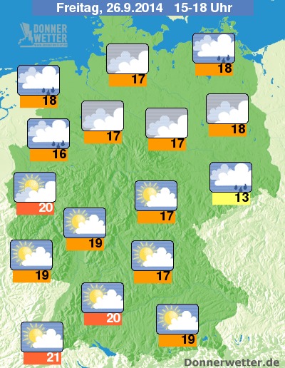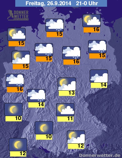 Am Abend ziehen in einem breiten Streifen von NRW, über die Mitte Deutschlands bis nach Berlin-Brandenburg dichte Wolken mit zeitweiligem Regen durch. Nordwestlich dieses Regenbandes bleibt es dagegen schon wieder weitgehend trocken und die Bewölkung lockert auf. Südlich bis Südöstlich des Regenbands ist es meist leicht bewölkt oder sogar klar und trocken. Die Temperatur liegt am Abend noch bei milden 16 Grad in Magdeburg und leicht frischen 10 Grad an der Schwäbischen Alb.