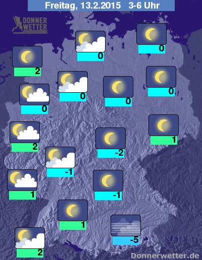 In der Nacht zum Freitag bleibt es in der Osthälfte der Republik überwiegend sternenklar, sonst ziehen von Westen her jedoch zeitweise einige Wolken durch und gebietsweise ist es auch stark bewölkt. Dabei bleibt es aber überall trocken. Die Temperatur sinkt auf 2 Grad in Köln und bis -5 Grad in München.