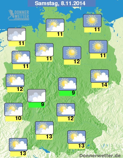 Am morgigen Samstag halten sich vor allem im Südosten und in der Mitte teils noch dichte Wolken aus denen hier und da etwas Regen fallen kann, sonst ist es abgesehen von regionalem Hochnebel jedoch aufgelockert bewölkt und häufig auch heiter mit zeitweiligem Sonnenschein. Die Temperatur steigt auf 9 Grad im Taunus und rund 14 Grad in der Lausitz.