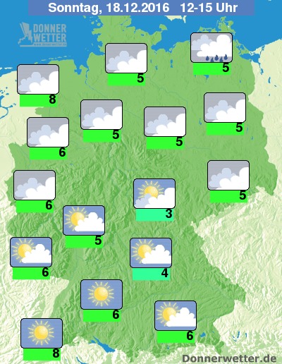 Heute Nachmittag ziehen über die Nordhälfte Deutschland verbreitet dichte Wolken hinweg, dabei fällt im Nordosten zeitweise Regen, sonst bleibt es größtenteils trocken. Weiter nach Süden hin kann sich zwischen den Wolken mehr und mehr auch die Sonne zeigen und am Alpenrand ist es sogar oft heiter oder sonnig, dazu bleibt es trocken. Die Temperatur liegt bei Werten zwischen 3 Grad im Vogtland und bis 8 Grad im Breisgau.