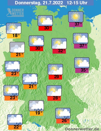 Heute Nachmittag ist es über der Nordosthälfte des Landes meist heiter und dazu trocken. Weiter nach Südwesten hin ziehen dagegen viele und oft dichte Wolken durch und es bilden sich vielerorts Schauer. Zudem bilden sich auch örtliche, teilweise schwere Gewitter. Die Temperatur liegt bei 18 Grad direkt an der Nordsee und bis zu 37 Grad in Berlin.