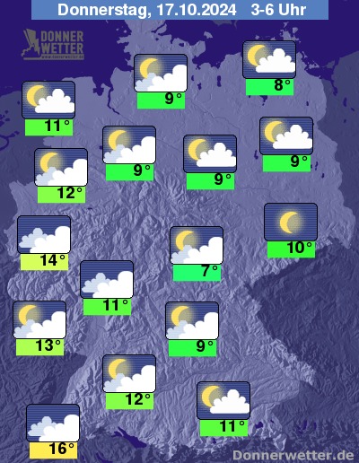 In der Nacht zum Donnerstag zeigt sich der Himmel über der Republik verbreitet aufgelockert oder stark bewölkt, vor allem vom Südosten, über den Osten bis in den Nordosten ist es auch oft nur gering bis wechselnd bewölkt. Es bleibt trocken bei Tiefstwerten von 16 Grad in Freiburg und 7 Grad in Jena.