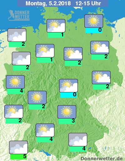Heute Nachmittag können sich vor allem an den Alpen, im Emsland und im Umfeld der Nordsee gebietsweise dichte Wolken halten, sonst zeigt sich im Land jedoch zumeist die Sonne und es ziehen verbreitet nur lockere Wolkenfelder durch. Zeitweise ist es auch sonnig, dazu bleibt es landesweit trocken. Die Temperatur liegt bei 0 bis 5 Grad.