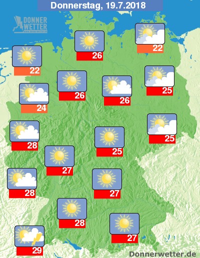 Am Donnerstag herrscht landesweit heiteres bis sonniges Sommerwetter, dabei bleibt es trocken. Lediglich am Schwarzwald sind örtliche Schauer oder Gewitter möglich. Die Temperatur steigt auf 22 Grad an den Küsten und bis 29 Grad im Oberrheingraben.