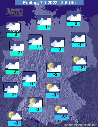 Am Freitag ziehen größtenteils dichte Wolken durch, lediglich im Südosten ist es anfangs noch oft aufgelockert bewölkt. Von Nordwesten her setzt zeitweise Schneefall, zum Teil auch Regen ein, der sich weiter nach Südosten hin ausbreiten. Im Osten und Südosten bleibt es bis zum Abend noch weitgehend trocken. Oft ist es jedoch auch neblig-trüb. Die Temperatur steigt auf 1 Grad in Mittelfranken und bis 4 Grad an der Nordsee.