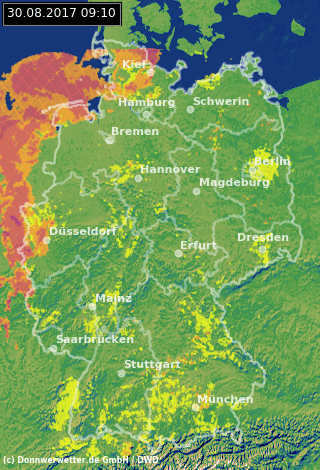 Aktuell zieht ein größeres Regenband über die Nordwesthälfte Deutschlands hinweg und sorgt in den nächsten Stunden für regionale Niederschläge. Teils auch kräftiger Regen ist am Vormittag vor allem über dem Norden Schleswig-Holsteins sowie auf einem Streifen zwischen den Ostfriesischen Inseln und der Eifel zu erwarten.