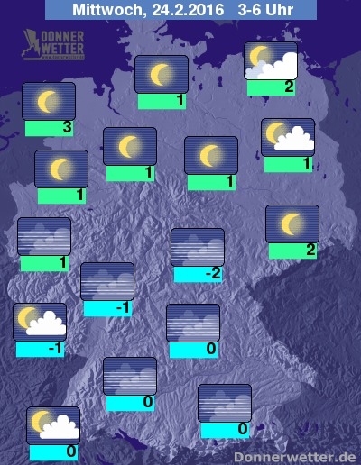 In der Nacht zum Mittwoch fällt am Alpenrand anfangs noch etwas Schnee, im übrigen Süden bleibt es oft neblig-trüb, jedoch trocken. Im Rest der Republik zeigt sich dagegen ein meist sternenklarer, hier und da ein locker bewölkter Himmel, dabei bleibt es trocken. Die Temperatur sinkt auf 3 Grad in Ostfriesland und bis -2 Grad im Grabfeld. Stellenweise besteht Glättegefahr durch möglichen Rauhreif!