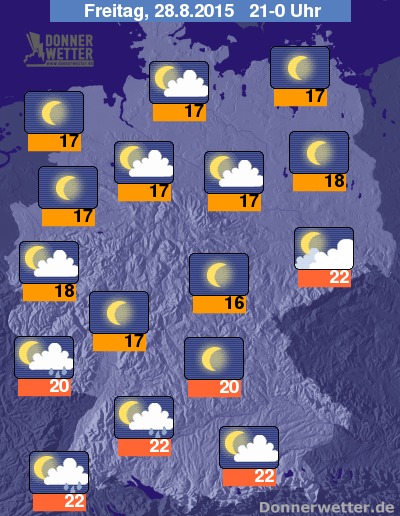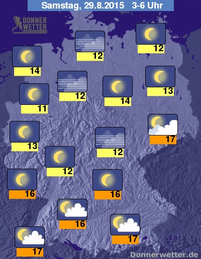 In der Nacht zum Samstag ziehen über Süddeutschland und über Sachsen meist einige Wolken, die jedoch keinen Regen bringen. Im großen Rest des Landes ist es verbreitet sternenklar und nur hier und da ziehen ein paar Wolken durch, dazu bleibt es trocken. Stellenweise bildet sich Nebel oder Hochnebel. Die Temperatur sinkt auf 17 Grad in Niederbayern und bis 11 Grad im Münsterland.