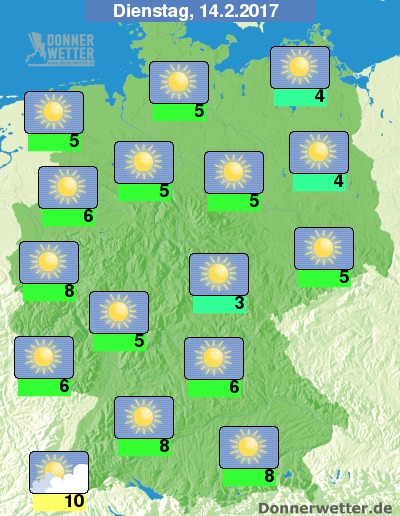 Am Dienstag erwarten uns ein verbreitet sonniger Tag bei einem oft stahlblauen Himmel. Gebietsweise mehr Wolken sind noch im Südwesten möglich, dazu bleibt es landesweit trocken. Die Temperatur steigt auf 3 bis 10 Grad.