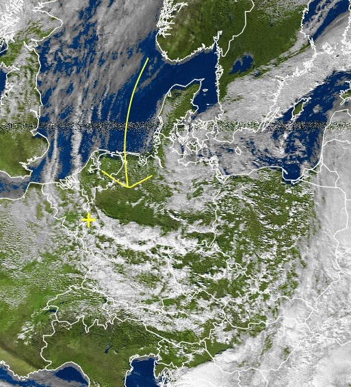 Kaltluft (gelber Pfeil) auf dem Weg nach Deutschland. Es wird eine kalte Luft. Weitere Satellitenbilder finden Sie hier.