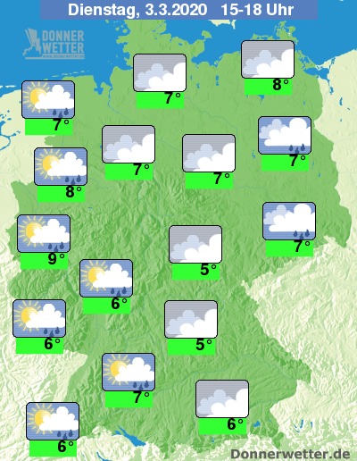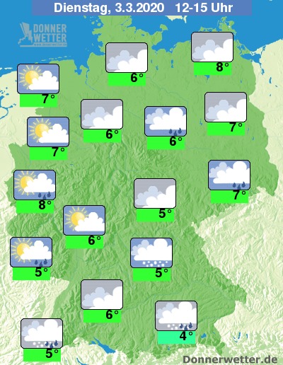 Am frühen Nachmittag halten sich meistens kompakte Wolken aus denen gelegentlichen Regen, im Bergland auch Schnee fallen kann. Nur im Westen wechseln sich Aufheiterhungen mit örtlichen Schauerwolken ab.