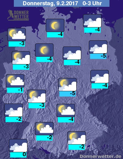 Die Tiefsttemperatur liegt am Morgen um minus 7 Grad C in Frankfurt an der Oder und die Höchsttemperatur um minus 1 Grad C im Westen bei Bonn.