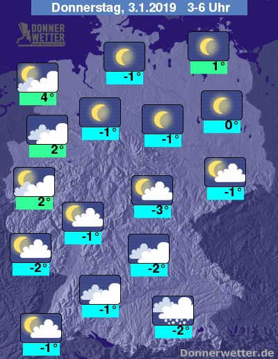 Die Temperaturen sinken auf -1 Grad C um Hamburg und 2 Grad C rund um Dortmund.