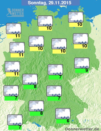 Am Sonntag bleibt es praktisch landesweit bei einem bedeckten Himmel und es fällt auch immer wieder, teils langanhaltender und kräftiger Regen. Die Temperatur steigt auf 6 Grad in Augsburg und bis 11 Grad entlang der Ems. Es weht verbreitet starker bis stürmischer Wind, auf den Bergen und an den Küsten herrscht teils schwerer Sturm.