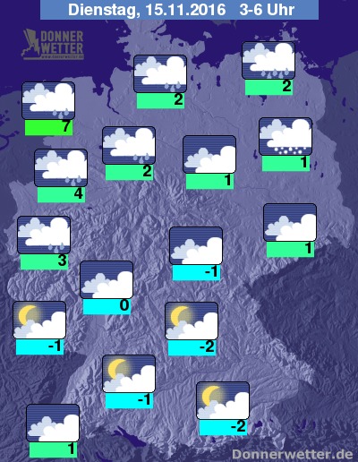 In der Nacht zum Dienstag bleibt es im Süden verbreitet aufgelockert, teils auch locker bewölkt und dazu trocken. In den anderen Landesteilen zeigt sich hingegen eine weitgehend verschlossene Wolkendecke, von der Mitte des Landes bis in den Osten ist es dabei noch verbreitet trocken, sonst fällt jedoch zeitweiliger Regen, der auf dem stellenweise gefrorenem Boden zu möglichem Blitzeis führen kann! Die Temperatur sinkt auf 7 Grad an der Nordsee und bis auf -2 Grad im Südosten.