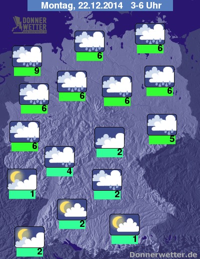 In der Nacht zum Montag ist es im Süden gebietsweise aufgelockert, sonst stark bewölkt. In den anderen Landesteilen ziehen hingegen weitgehend dichte Wolken durch, und vor allem im Norden fällt dazu teils kräftiger Regen. Der Wind weht vielfach stark bis stürmisch, in Böen und an der See auch orkanartig. Die Temperatur sinkt auf 9 Grad in Emden und bis 1 Grad in Oberbayern.