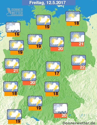 Am freundlichsten und wahrscheinlich auch den ganzen Tag trocken ist es in der Uckermark. Sonst dominieren zeitweise die Wolken. Mit etwas sonniger Einstrahlung entwickeln sich tagsüber gebietsweise mächtige Haufenwolken, die sich in Form teils kräftiger gewittriger Regengüsse entladen. Örtlich kann es auch zu Hagelschlag kommen. Die Höchsttemperaturen liegen meist zwischen 16 und 24 Grad. Die Nächte bleiben mild. Stellenweise kann sich in der feuchten Luft auch Dunst und Nebel bilden.