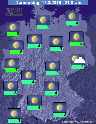Heute Abend bleibt es in Deutschland praktisch landesweit sternenklar, ein paar wenige Wolken können über die Lausitz hinwegziehen. Es bleibt landesweit trocken bei Abendwerten von 7 Grad in Düsseldorf und etwa 2 Grad in Oberfranken.