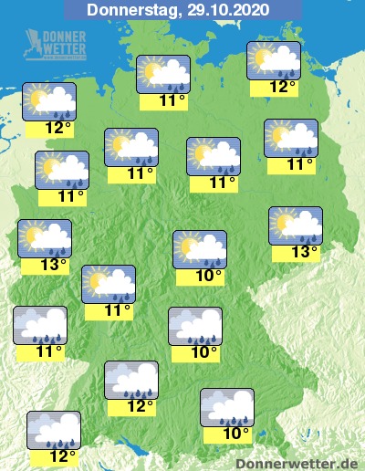 Nach Abzug eines Regenbandes stellt sich im Norden und in der Landesmitte ein rascher Wechsel aus Sonne und dickeren Haufenwolken mit örtlichen Schauern ein. Im Küstenbereich von Nord- und Ostsee, sowie über Schleswig-Holstein kann es vereinzelt auch mal blitzen und donnern. Im Süden bleiben die Wolken kompakter und es regnet noch für längere Zeit und teilweise auch kräftiger.
