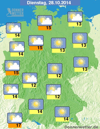 Der morgige Dienstag bringt goldenes Herbstwetter, wie es im Buche steht! Vor allem im der Osthälfte darf man sich häufig über strahlenden Sonnenschein freuen, im Nordwesten kann es auch mal etwas wolkiger zugehen. Trocken bleibt es bei Höchstwerten um 12 Grad C in den Mittelgebirgen und um 17 Grad im Breisbau aber überall!