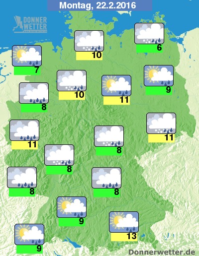 Die Temperaturen liegen am Montag bei Höchstwerten um 6 Grad C an der Ostseeküste und um 11 Grad C im Rheinland.