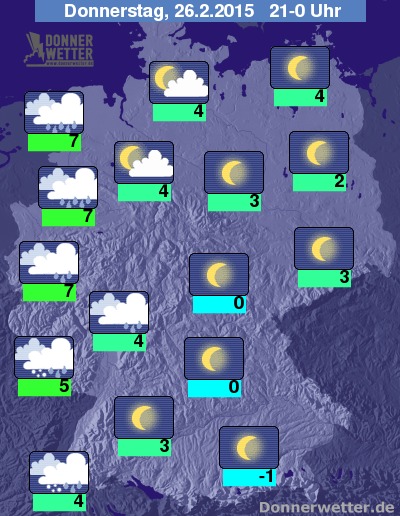 In der Nacht zum Freitag verlagern sich die dichten Regenwolken ein Stück weiter nach Osten, jedoch bleibt es in der Osthälfte selbst weiterhin oft sternenklar oder nur locker bewölkt und dazu trocken. In der Westhälfte fällt jedoch zeitweise Regen, zum Teil sind auch Schneeregen oder Schnee möglich. Örtlich kann es glatt auf den Straßen werden. Die Tiefstwerte liegen bei 5 Grad in Emmerich und um -3 Grad im Pfaffenwinkel.