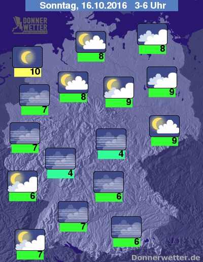In der Nacht zum Sonntag halten sich über dem Nordosten dichte Wolken aus denen es hier und da etwas regnen kann. Über der Südwesthälfte zeigt sich der Himmel leicht bewölkt oder sternenklar, stellenweise bilden sich Nebel oder Hochnebel. Im übrigen Bundesgebiet ist es meist locker oder aufgelockert bewölkt und dazu trocken. Die Temperatur sinkt auf 10 bis 4 Grad.