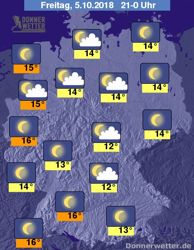 Während der zweiten Nachthälfte bleibt es vielfach sternenklar oder nur leicht bewölkt. In einigen Flussniederungen und Mittelgebirgstälern können sich allerdings wieder Nebelfelder bilden. Bis zu den Frühstunden kühlt die Luft bei einem schwachen Wind auf 9 bis 14 Grad ab, was für einen Oktober schon nahezu ungewöhnlich mild ist.
