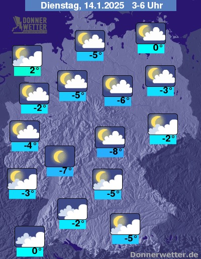 In der Nacht zum Dienstag zeigt sich der Himmel über dem Norden oft stark bewölkt und es kann etwas Regen fallen, teils auch gefrierend. Vorsicht, Glättegefahr! In den übrigen Landesteilen ist es wolkig oder gering bewölkt, im Süden auch sternenklar, und es bleibt trocken. Gebietsweise kann sich Nebel bilden.