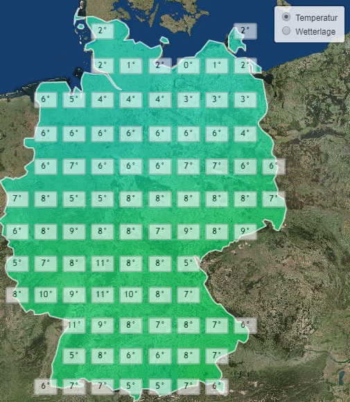 Dabei klafft zwischen der Nord- und Südhälfte eine gravierende Temperaturdifferenz. Während das Thermometer an der Ostseeküste kaum über den Gefrierpunkt steigt, werden im südlichen Hessen und nördlichen Baden-Württemberg Höchstwerte im zweistelligen Bereich erwartet.
